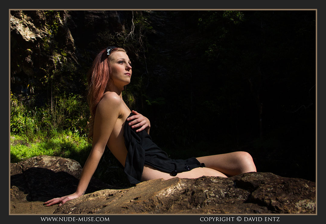 Adrienne looked like a nude nymph, was she posed next to a waterfall. No wonder why an unexpected group of tourists couldn't pull themselves aways from the sight. For a while Adrienne kept a towel around her and she waited for them to go. However it was soon evident that they wished to stay to admire the view. Adrienne, being the type of model that wishes to please, decided to drop the towel and continue the photo shoot. This resulted in a admiring gazes of the tourists and chuckles of delight as they too snapped away with their mobile devices.