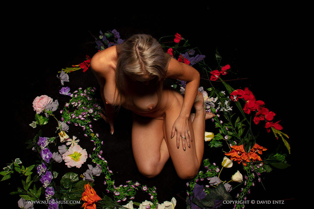 A floral display frames the amazing fit nude form of Brittany-Savage in this art nude series. A classic low key figure study with a much more colourful take.