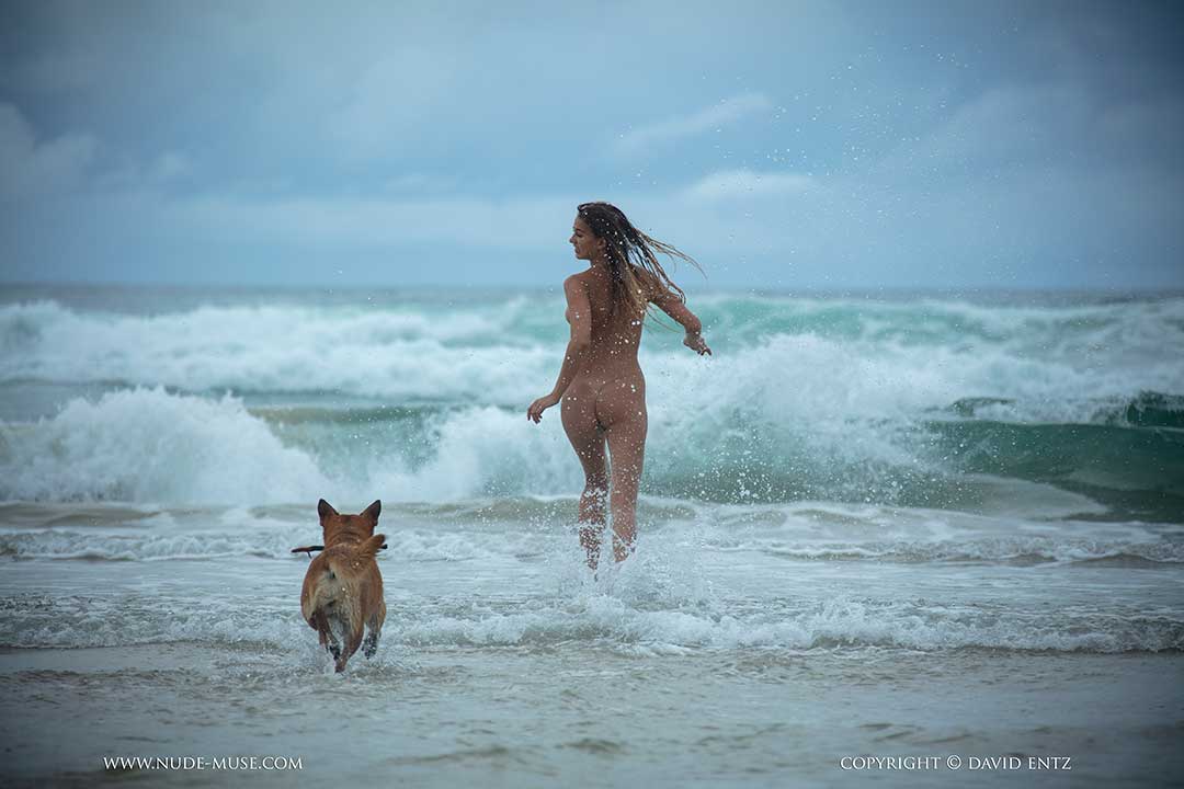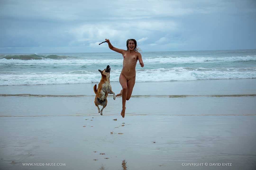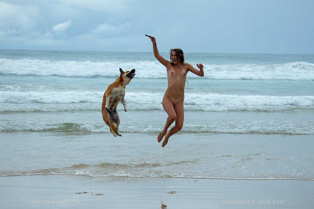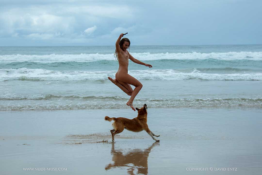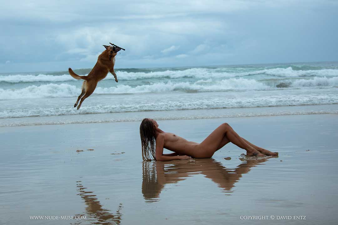 Dingos are a native species to Australia. Elly just so happens to have one for a pet. What you see here is what Elly does quite often. Take her pet dingo to the beach, go topless or nude, and just play in the surf.