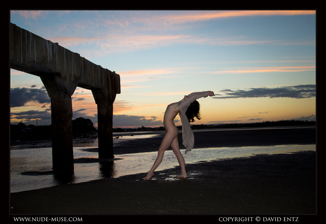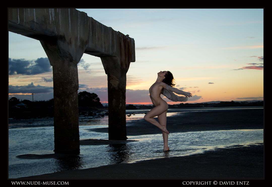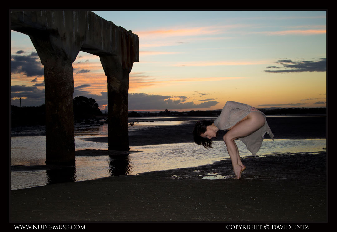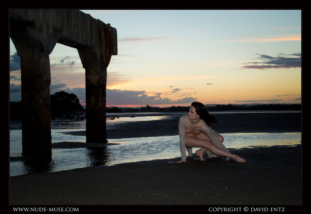Finally we arrived, but wa it too late? It looked like the sunset might become ruined and we still didn’t know exactly where we would do the shoot, as everything looked ordinary. It was quite dark with the sun behind the clouds and extremely low on the horizon. We had to make a decision. Although it was low tide, the water hadn’t fully receded and I had my good shoes on. Good thinking David. Really thinking ahead there. Then I remembered the old highway that used to cross the peninsula, but was torn down due to it being too old and unsafe even for pedestrian access. At the same time Lilly-Rae must of had the same idea as she pointed to the old pillars still left standing. We scrambled over some rocks and slushed our way across muddy wet sand. The wind was biting even through clothes. It was an unseasonally cold snap in the last two weeks of winter.
