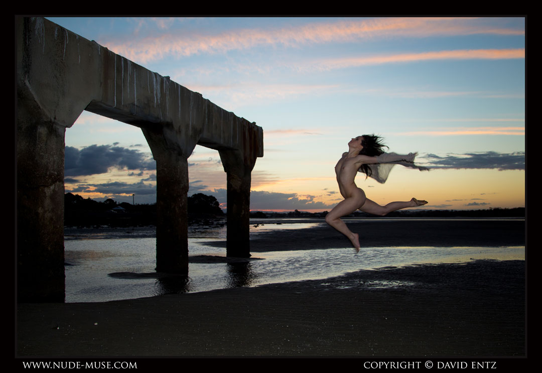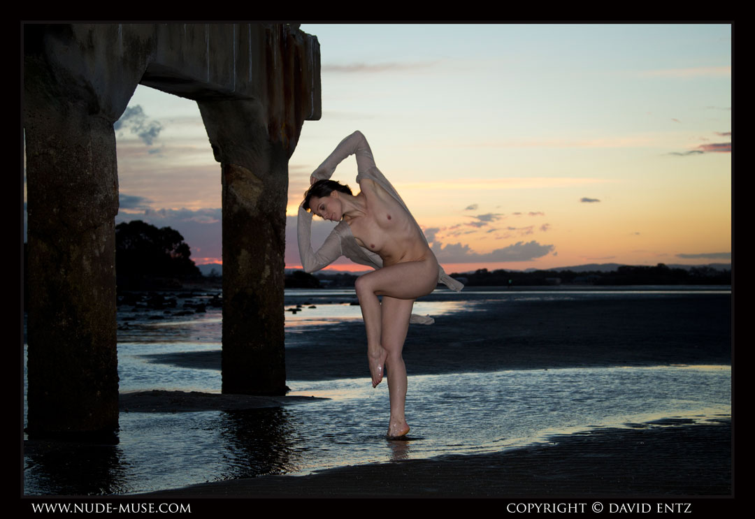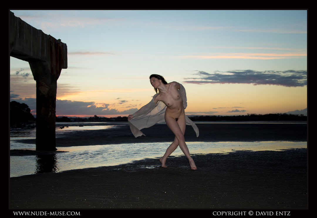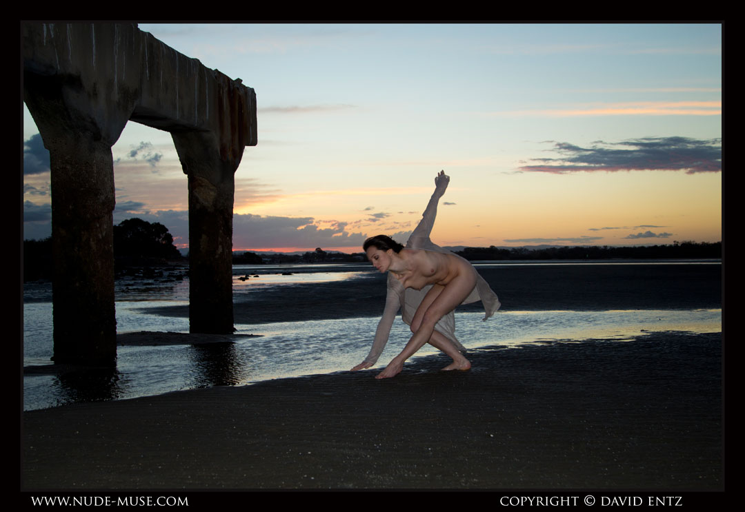 Finally we arrived, but wa it too late? It looked like the sunset might become ruined and we still didn’t know exactly where we would do the shoot, as everything looked ordinary. It was quite dark with the sun behind the clouds and extremely low on the horizon. We had to make a decision. Although it was low tide, the water hadn’t fully receded and I had my good shoes on. Good thinking David. Really thinking ahead there. Then I remembered the old highway that used to cross the peninsula, but was torn down due to it being too old and unsafe even for pedestrian access. At the same time Lilly-Rae must of had the same idea as she pointed to the old pillars still left standing. We scrambled over some rocks and slushed our way across muddy wet sand. The wind was biting even through clothes. It was an unseasonally cold snap in the last two weeks of winter.