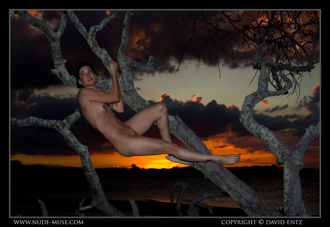 Originally we wanted to do photos in another area, but as luck would have that area had bitterly cold wind howling through and two fishermen set up camp in the very spot we wanted to shoot, so we went to this location instead. It turned out to be sheltered from the wind and gave a perfect view of both the sunset and Angela in a tree. We can’t think of a better combo. Two kayakers, a landscape photographer and two dog walkers all agreed with us on this one. They loved Angela’s nude form and think you will too. Enjoy, because that is what art is. To be looked at and enjoyed.