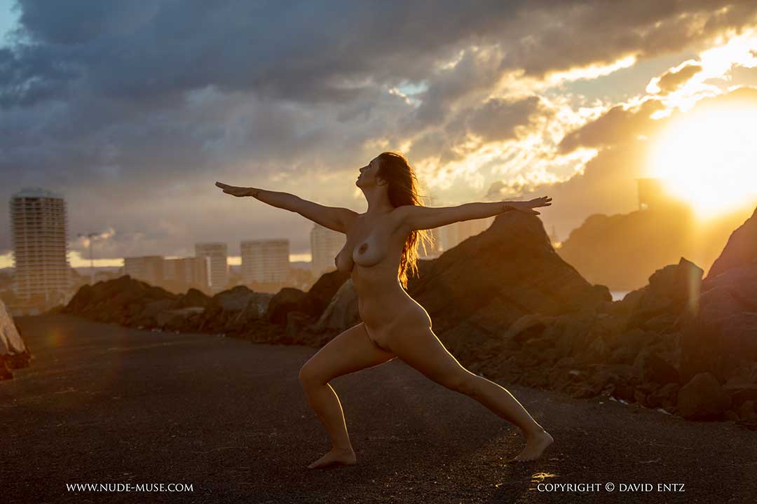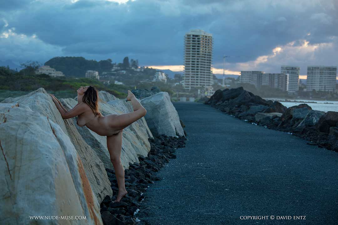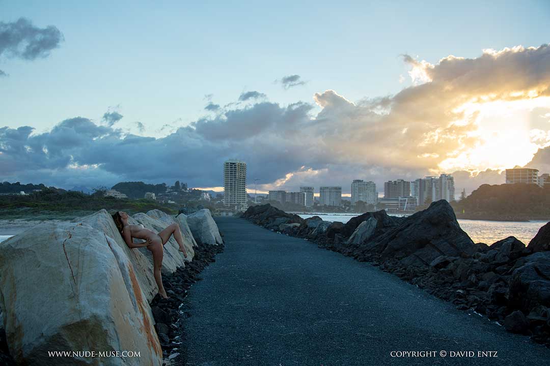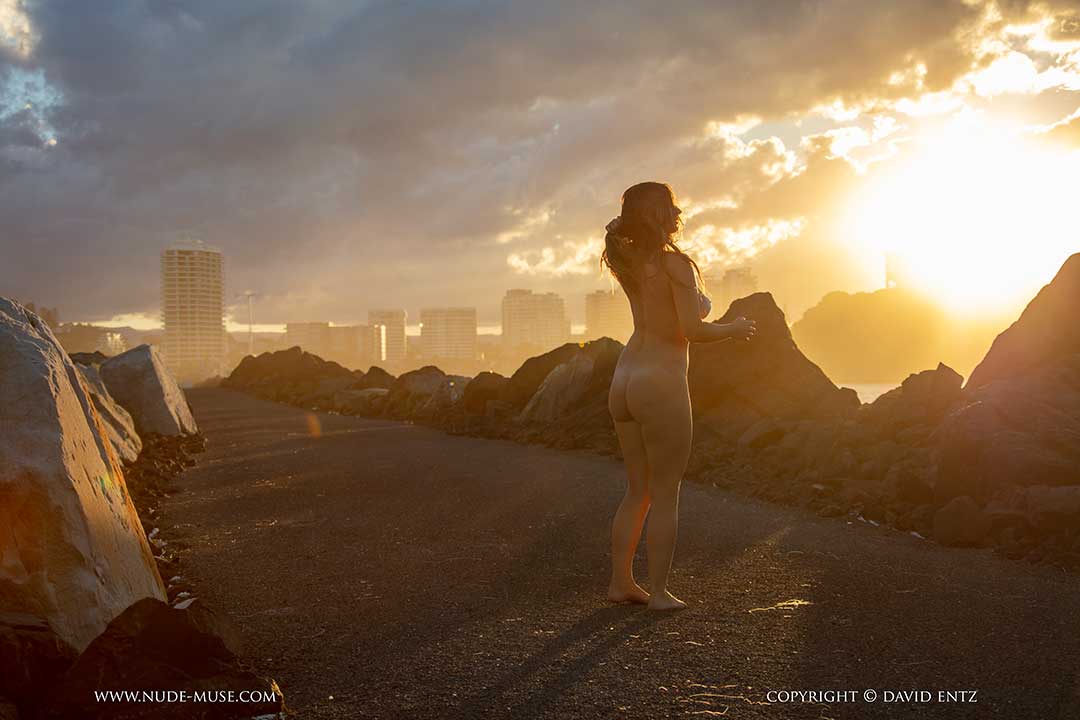 We wanted to capture the sun setting over the city as well as the beautiful natural surroundings we live in. This long rock wall was the perfect setting. It is used by many local fishermen and as you will see they didn’t mind Scarlett-Morgan's nudity one bit.