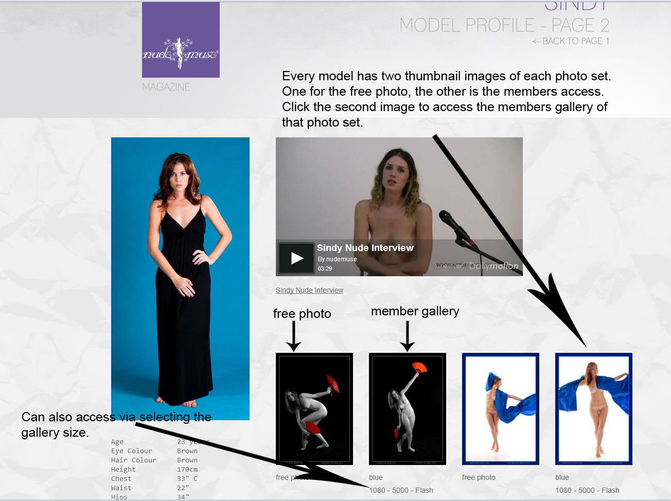 you will see two thumbnails of each photo set. One is the free photo available to everyone, the other is your link to the members only photo set. The videos of that models will be located on the left hand side, just under the models main image and statistics. If there are no thumbnails under the main image and statistics, then that model does not have any videos.